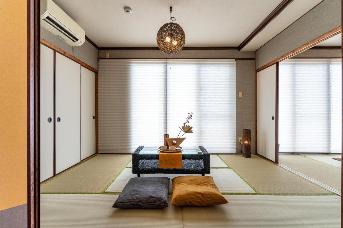 Three-Bedroom Apartment. Boasting a private entrance, this spacious apartment also includes 3 separate bedrooms and 1 bathroom with a bath and a shower. The apartments kitchen, which has a refrigerator and a microwave, is available for cooking and storing food. The apartment offers air conditioning, a washing machine, tatami, tumble dryer, as well as a flat-screen TV. The unit has 5 beds and 3 futons.