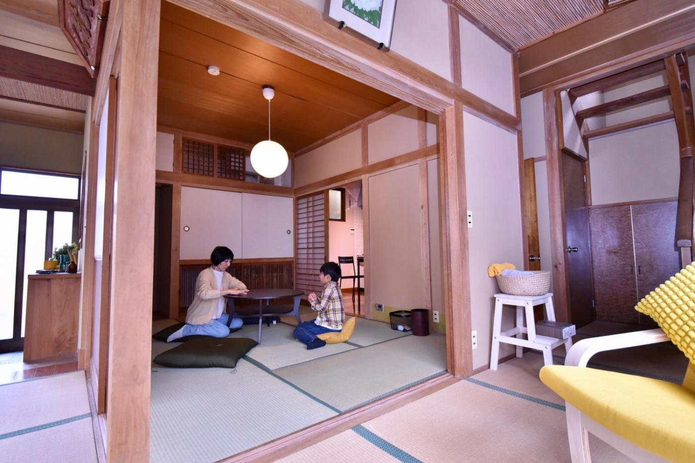 One-Bedroom Apartment. This spacious apartment consists of 2 living rooms, 1 separate bedroom and 1 bathroom with a bath and a shower. The fully equipped kitchen features a stovetop, a refrigerator, kitchenware and a microwave. The apartment provides air conditioning, tatami, a seating area as well as a terrace with ancourtyard view. The unit offers 6 futons.