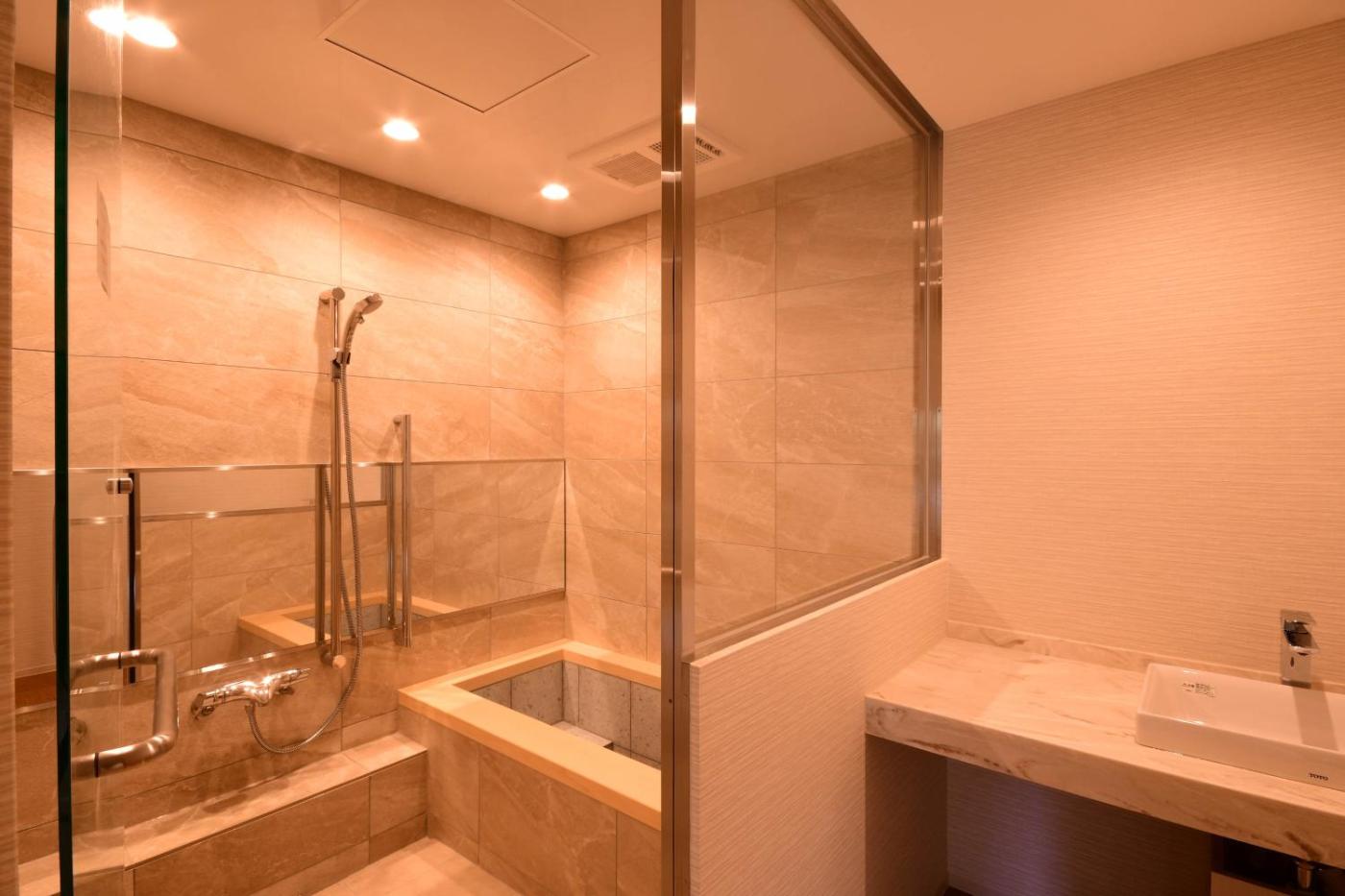 Fitted with tatami (woven-straw) flooring and traditional futon bedding, each room comes with a flat-screen TV and a seating area. A safety deposit box is also provided.