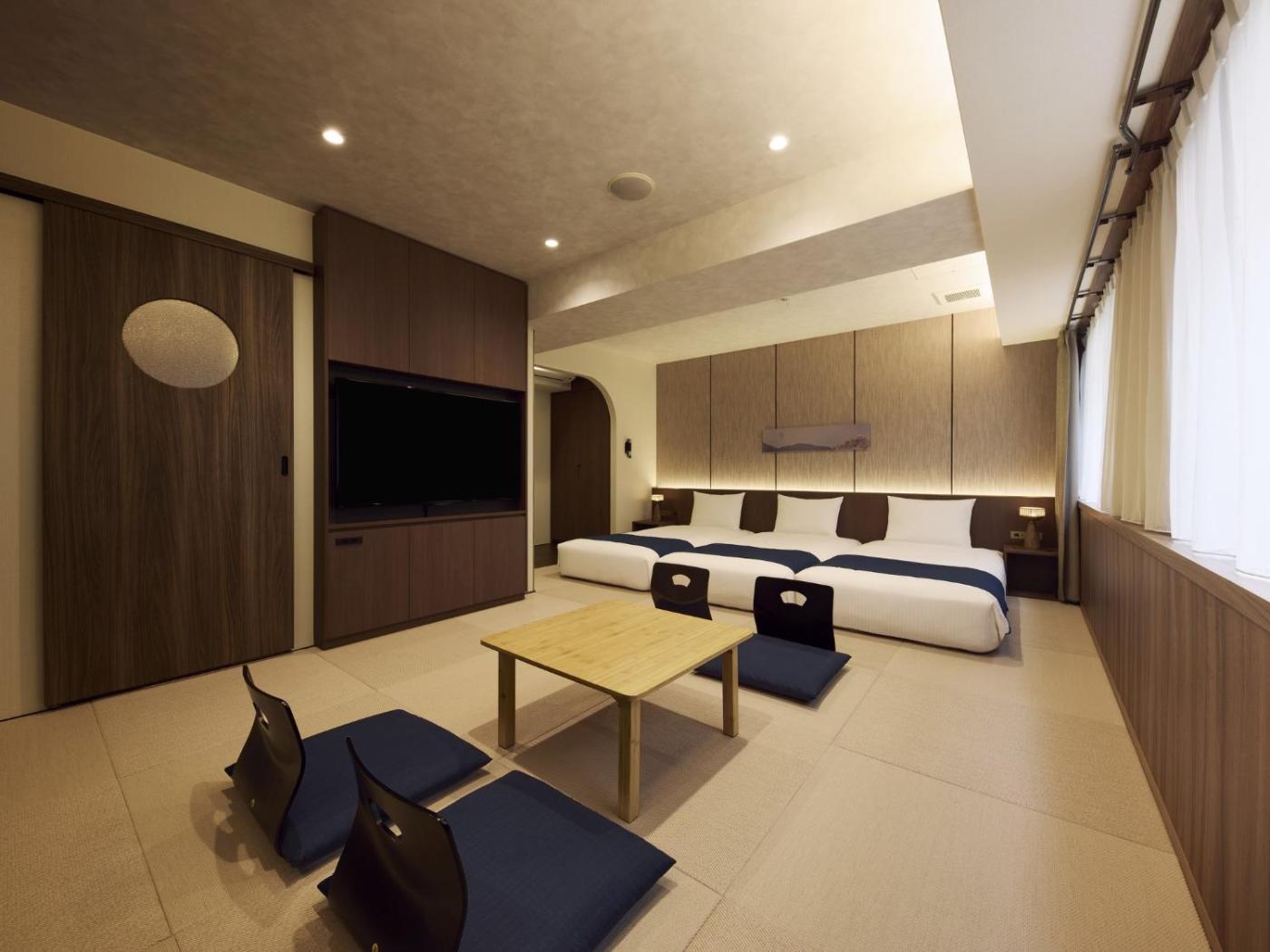 Deluxe Room -KASUMI - Non-Smoking ( 1-6 adults ). The spacious triple room features air conditioning, tatami, as well as a private bathroom boasting a bath and a shower. The triple room provides soundproof walls, a wardrobe, a safe deposit box, an electric kettle and a flat-screen TV. The unit has 3 beds and 3 futons. ;