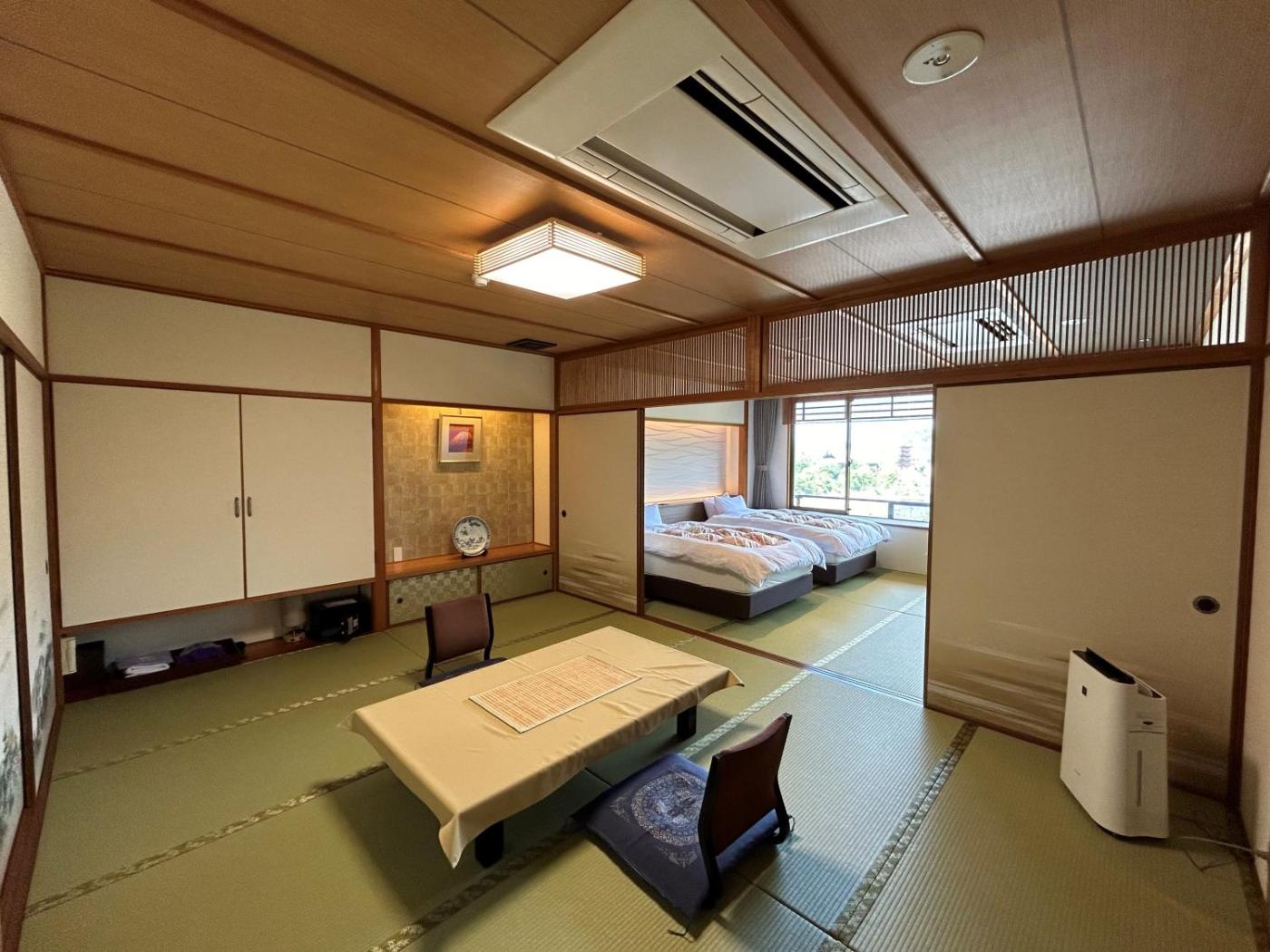 Japanese-Style Room with Mountain View - Non-Smoking. Room is fitted with a flat-screen TV, a mini-fridge and an en suite bathroom. Yukata robes and green tea are provided. Guests sleep in Japanese futon bedding on the tatami (woven mat) floor. ;