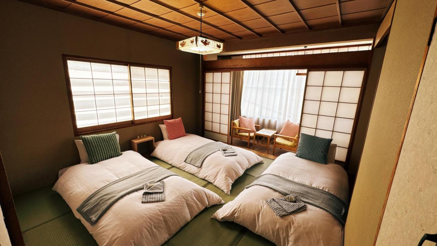 Quadruple Room. Featuring free toiletries and bathrobes, this quadruple room includes a shared bathroom with slippers. This quadruple room is air-conditioned and has tatami, yukata and a quiet street view. The unit has 3 beds. ;