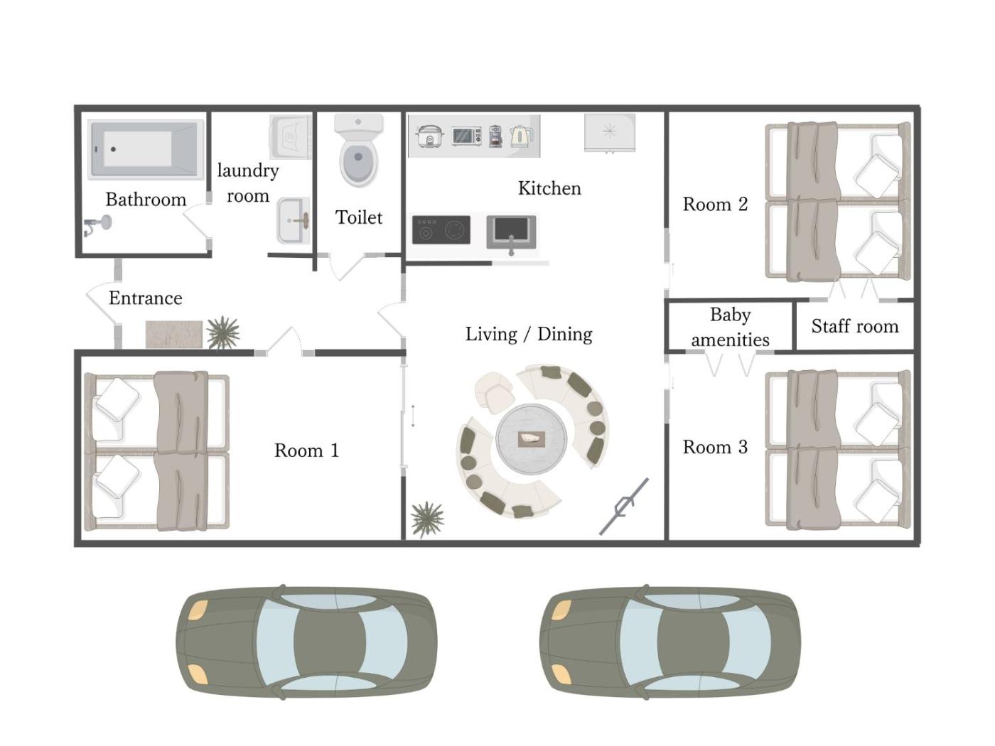 Three-Bedroom Apartment. The air-conditioned apartment features 1 bedroom and 1 bathroom with a bath and a shower. Meals can be prepared in the well-fitted kitchen, which is fitted with a stovetop, a refrigerator, kitchenware and a microwave. The apartment offers a coffee machine, a seating area, a dining area, a wardrobe, as well as a flat-screen TV. The unit offers 1 bed.