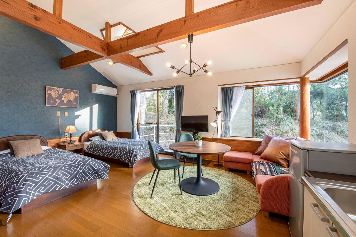 Two-Bedroom Villa. Boasting a private entrance, this air-conditioned villa includes a kitchen, 2 bedrooms and 1 bathroom with a bath and a shower. Guests will find a stovetop, a refrigerator, kitchenware and a microwave in the well-equipped kitchen. The villa also features a barbecue. This villa has tatami, a seating area, a flat-screen TV and a terrace. The unit has 2 beds and 3 futons. ;