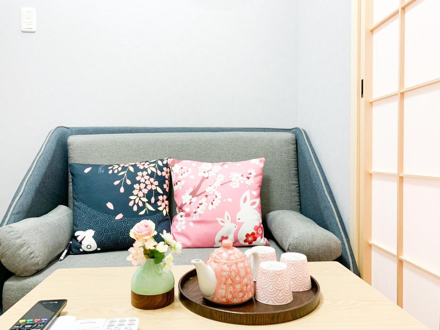 Sakura. This apartment comes with 1 living room, 1 separate bedroom and 1 bathroom with a bath and free toiletries. The well-equipped kitchenette features a stovetop, a refrigerator, kitchenware and a microwave. This apartment is air-conditioned and has a TV, a washing machine, tatami and a dining area. The unit has 2 beds. ;