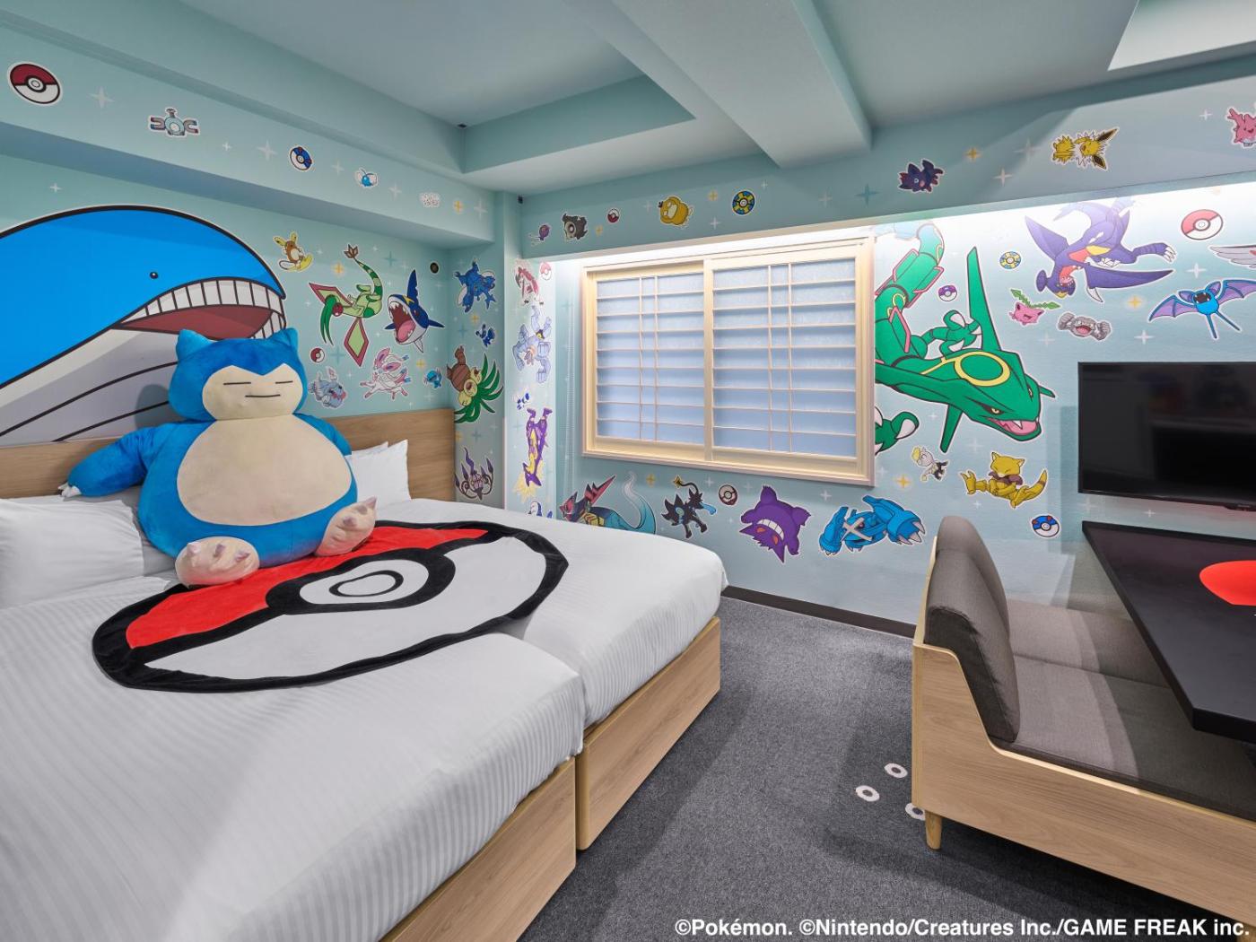Pokémon ROOM. The spacious family room offers air conditioning, a seating area, as well as a private bathroom boasting a bath and a shower. In the well-equipped kitchen, guests will find a refrigerator, kitchenware, a microwave and an electric kettle. The family room provides a dining area, a wardrobe, a safe deposit box, a sofa, as well as a flat-screen TV. The unit has 3 beds.