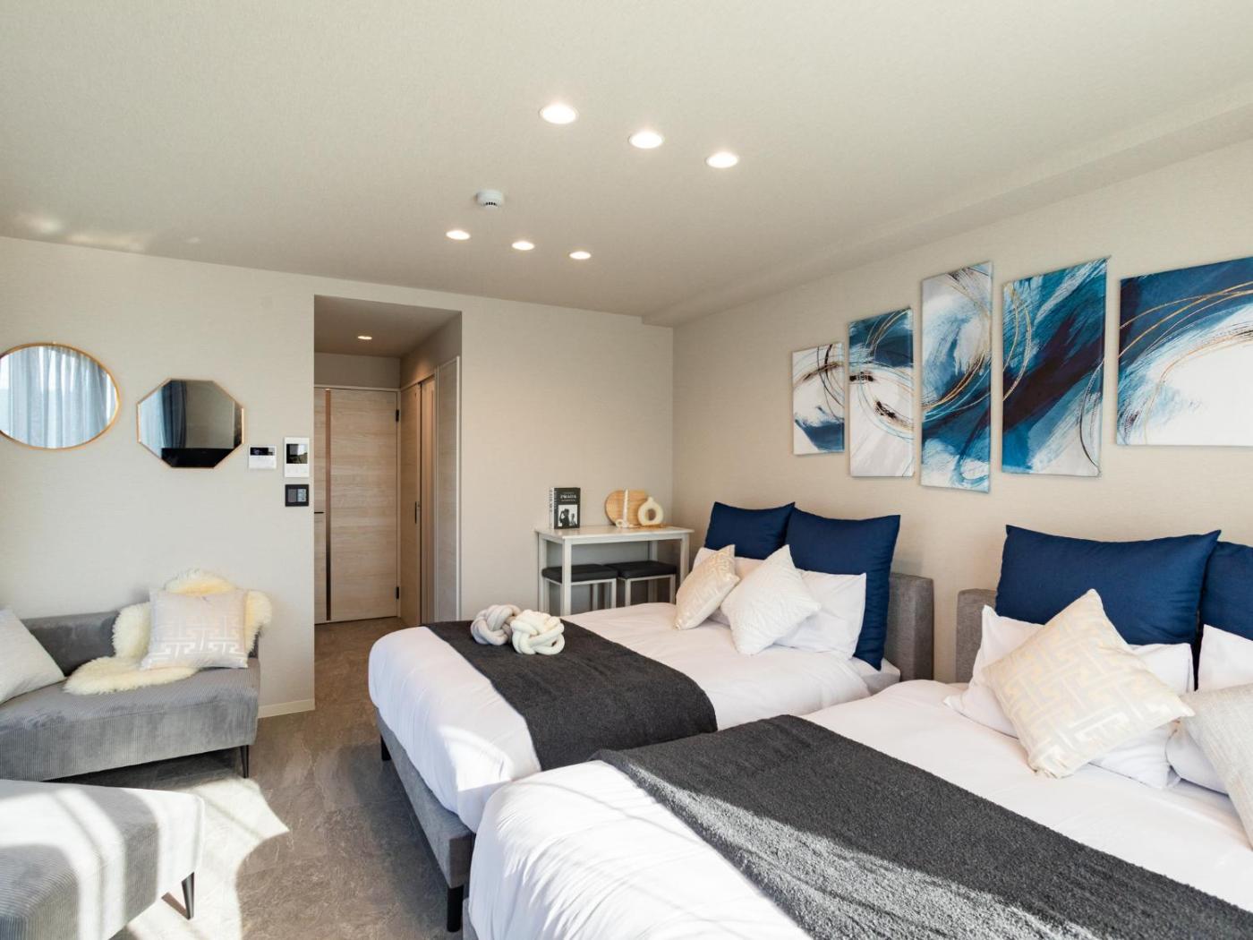 Two-Bedroom Apartment. This apartments special feature is the hot tub. Featuring a private entrance, this air-conditioned apartment consists of a kitchen, 2 bedrooms and 1 bathroom with a bath and a shower. Guests can make meals in the kitchen that is equipped with a stovetop, a refrigerator, kitchenware and a microwave. The apartment provides a flat-screen TV with streaming services, a washing machine, tatami, soundproof walls as well as city views. The unit offers 2 beds and 1 futon.