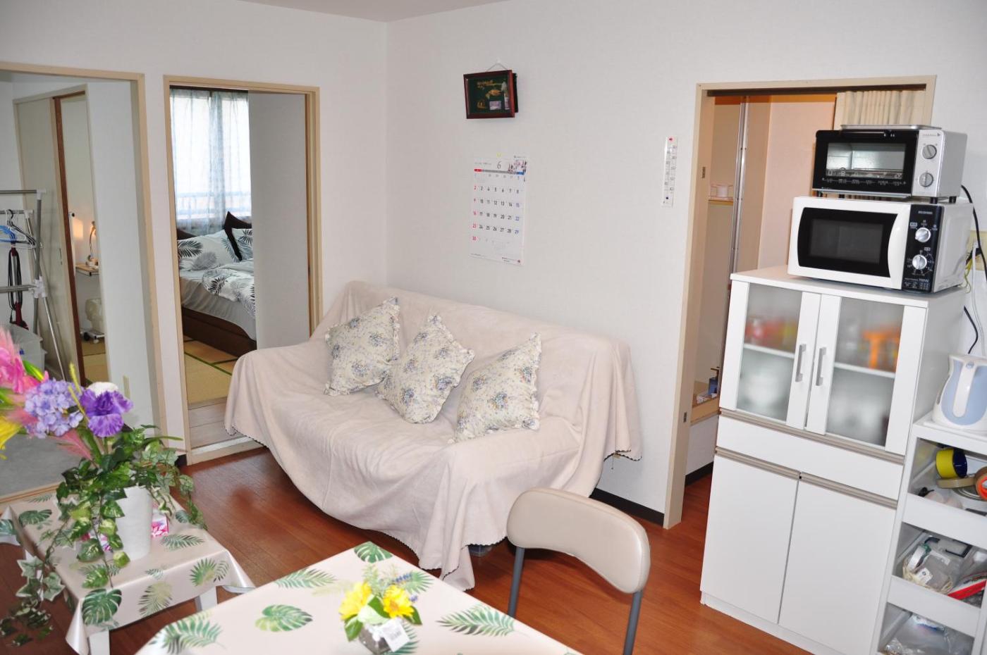Two-Bedroom Apartment. This air-conditioned apartment comes with 1 living room, 2 separate bedrooms and 1 bathroom with a bath. Meals can be prepared in the kitchen, which features a stovetop, a refrigerator, kitchenware and a microwave. The apartment features a washing machine, tatami, a tea and coffee maker, a sofa, as well as a flat-screen TV. The unit has 3 beds and 3 futons. ;