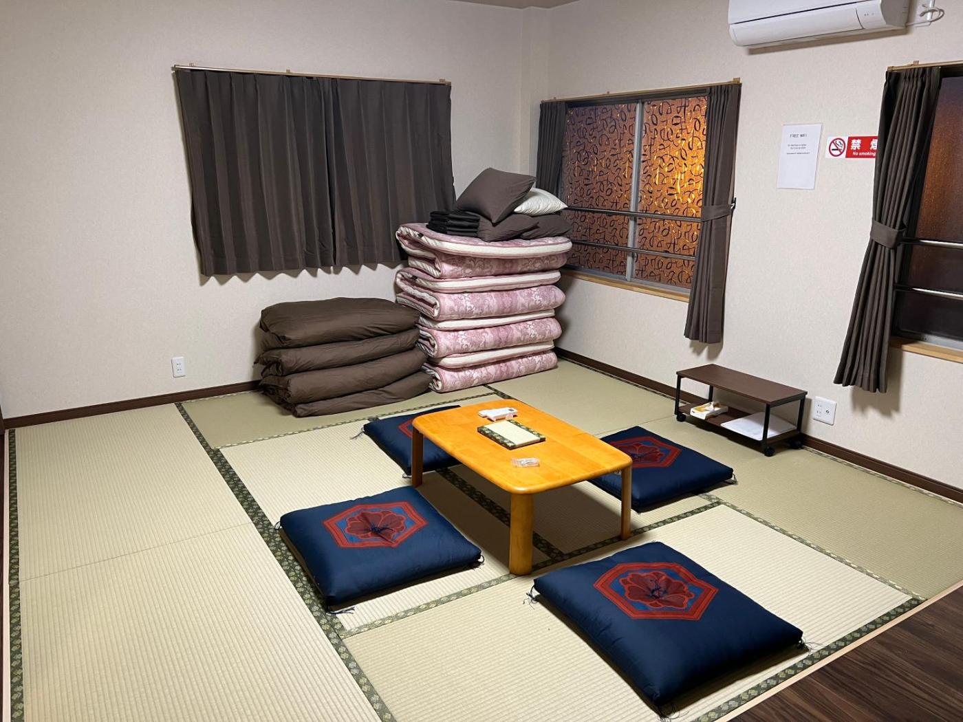 King Room. The spacious double room features air conditioning, tatami, as well as a private bathroom boasting a bath and a shower. The double rooms kitchen, which has a refrigerator, is available for cooking and storing food. The double room offers soundproof walls, a tea and coffee maker, a wardrobe, a barbecue, as well as a flat-screen TV. The unit has 4 futons. ;