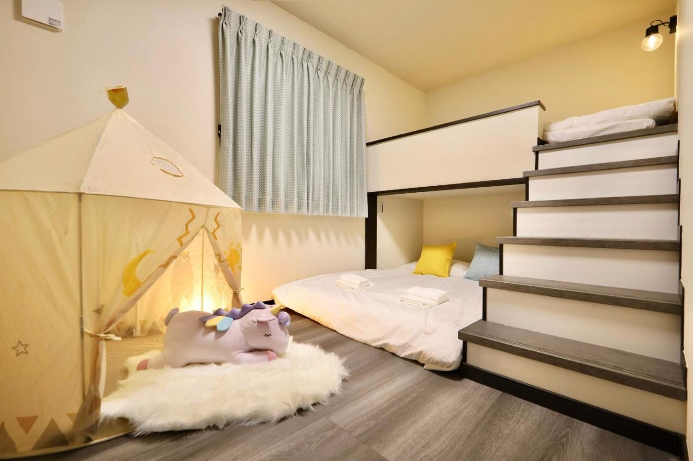 Apartment. The hot tub is the standout feature of this apartment. This spacious apartment includes 1 living room, 2 separate bedrooms and 1 bathroom with a bath and free toiletries. Meals can be prepared in the well-fitted kitchen, which has a stovetop, a refrigerator, a dishwasher and kitchenware. This apartment is air-conditioned and has a washing machine, tatami as well as a terrace with city views. The unit has 1 bed and 4 futons.