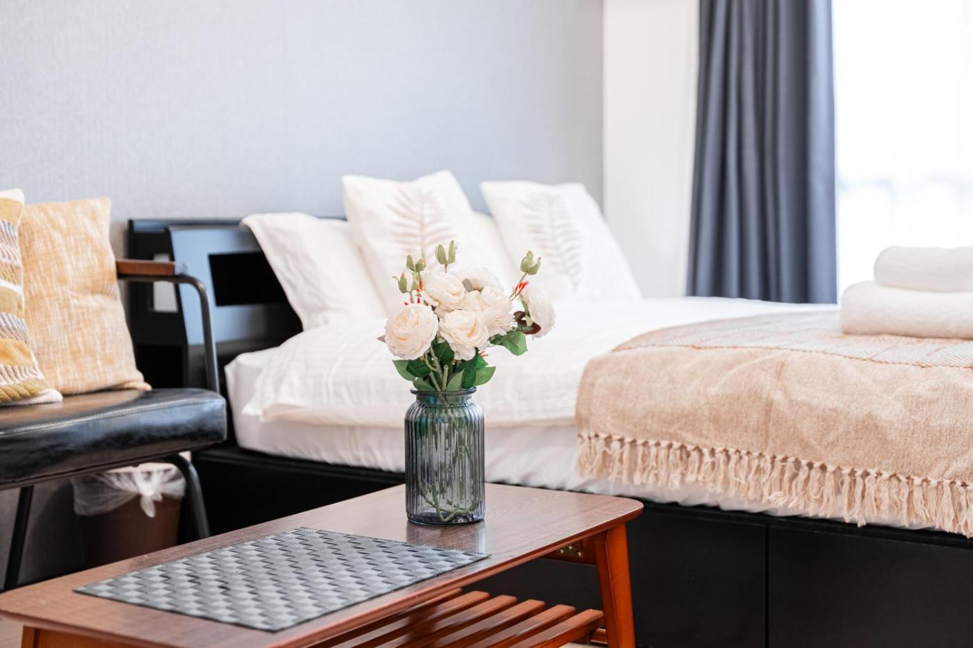 One-Bedroom Apartment. This apartment offers a hot tub. The air-conditioned apartment features 1 bedroom and 1 bathroom with a bath and a hairdryer. Guests can make meals in the kitchen that comes with a stovetop, a refrigerator, kitchenware and a microwave. The apartment provides a washing machine, tatami, a wardrobe and a TV. The unit offers 1 bed and 2 futons. ;