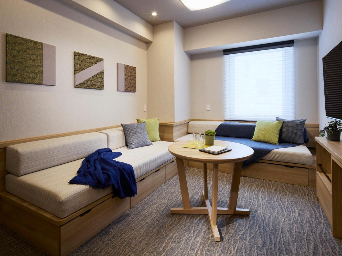 Classic Quadruple Room. The quadruple room provides air conditioning, a washing machine, as well as a private bathroom featuring a bath and a shower. The fully equipped kitchen features a stovetop, a refrigerator, kitchenware and a microwave. The quadruple room features tatami, a dining area, a wardrobe, a safe deposit box and a flat-screen TV. The unit offers 3 beds and 1 futon. ;