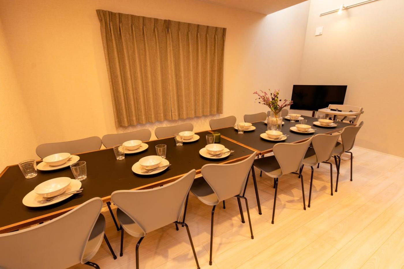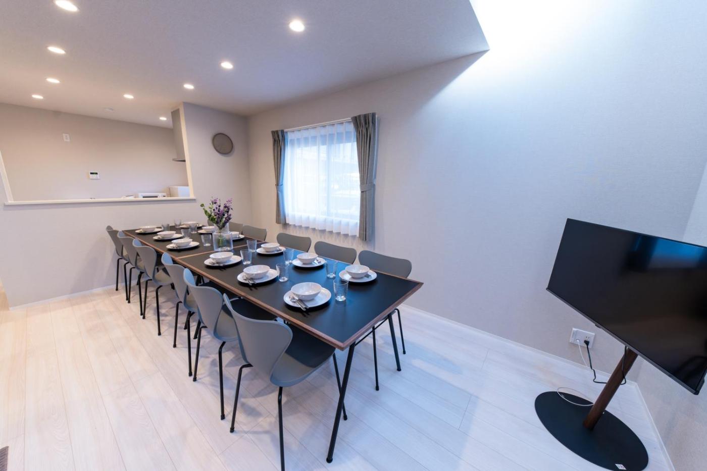 Four-Bedroom House. Featuring a private entrance, this air-conditioned holiday home comprises 1 living room, 4 separate bedrooms and 2 bathrooms with a bath and a shower. Meals can be prepared in the kitchen, which comes with a stovetop, a refrigerator, kitchenware and a microwave. The spacious holiday home provides a washing machine, tatami, a dining area, an electric kettle and a flat-screen TV. The unit offers 7 beds and 2 futons.