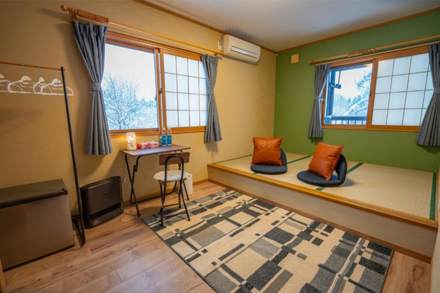 Family Room. Guests will have a special experience as the family room offers a fireplace. The family rooms kitchenette, which features a refrigerator and kitchenware, is available for cooking and storing food. The family room provides tatami, a tea and coffee maker, as well as a private bathroom featuring a bath or a shower and a hairdryer. The unit offers 8 futons.