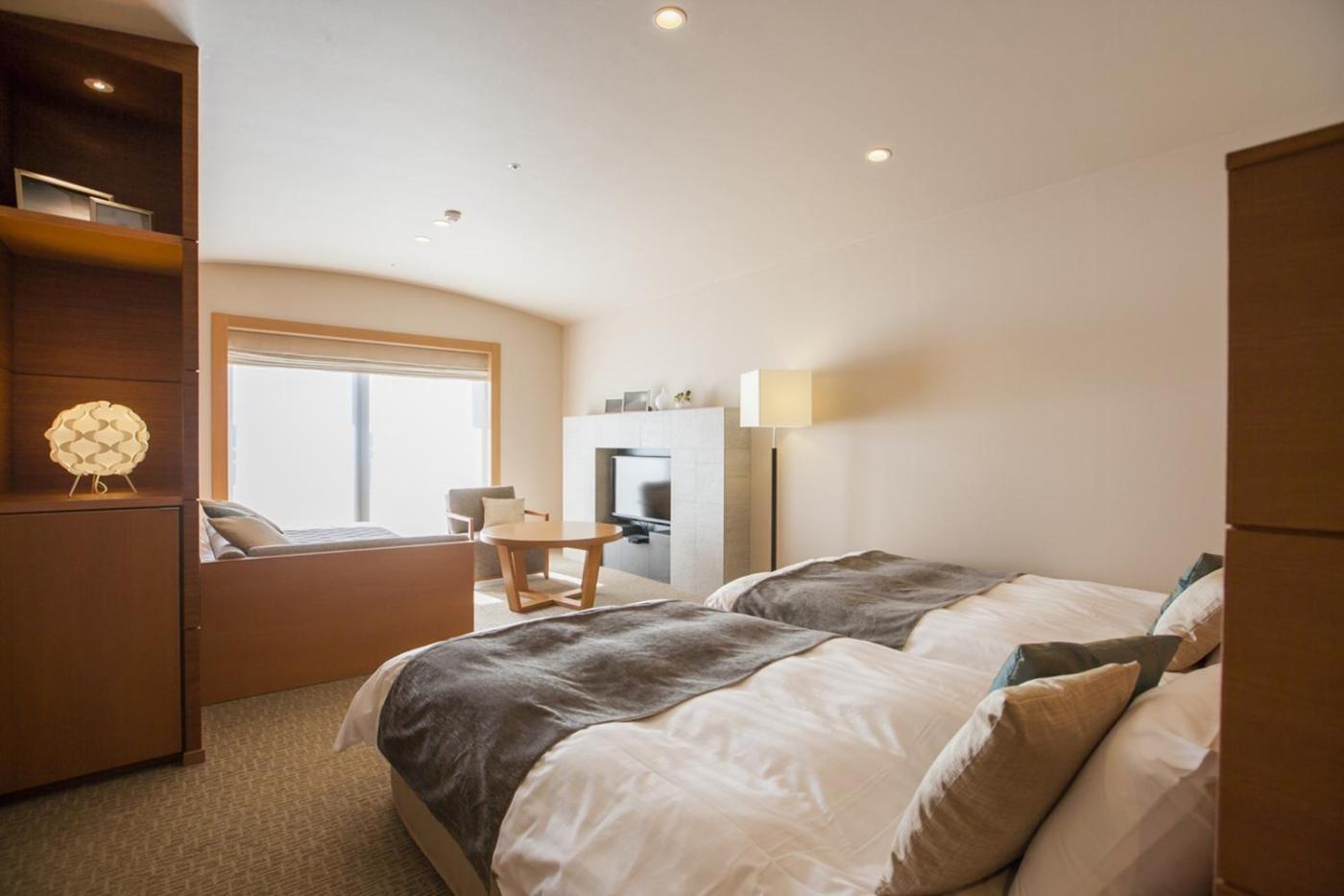 Standard Twin Room - Non-Smoking. Bright room featuring an interior in neutral colours, a TV and a fridge. Yukata robes and toiletries are provided. ;