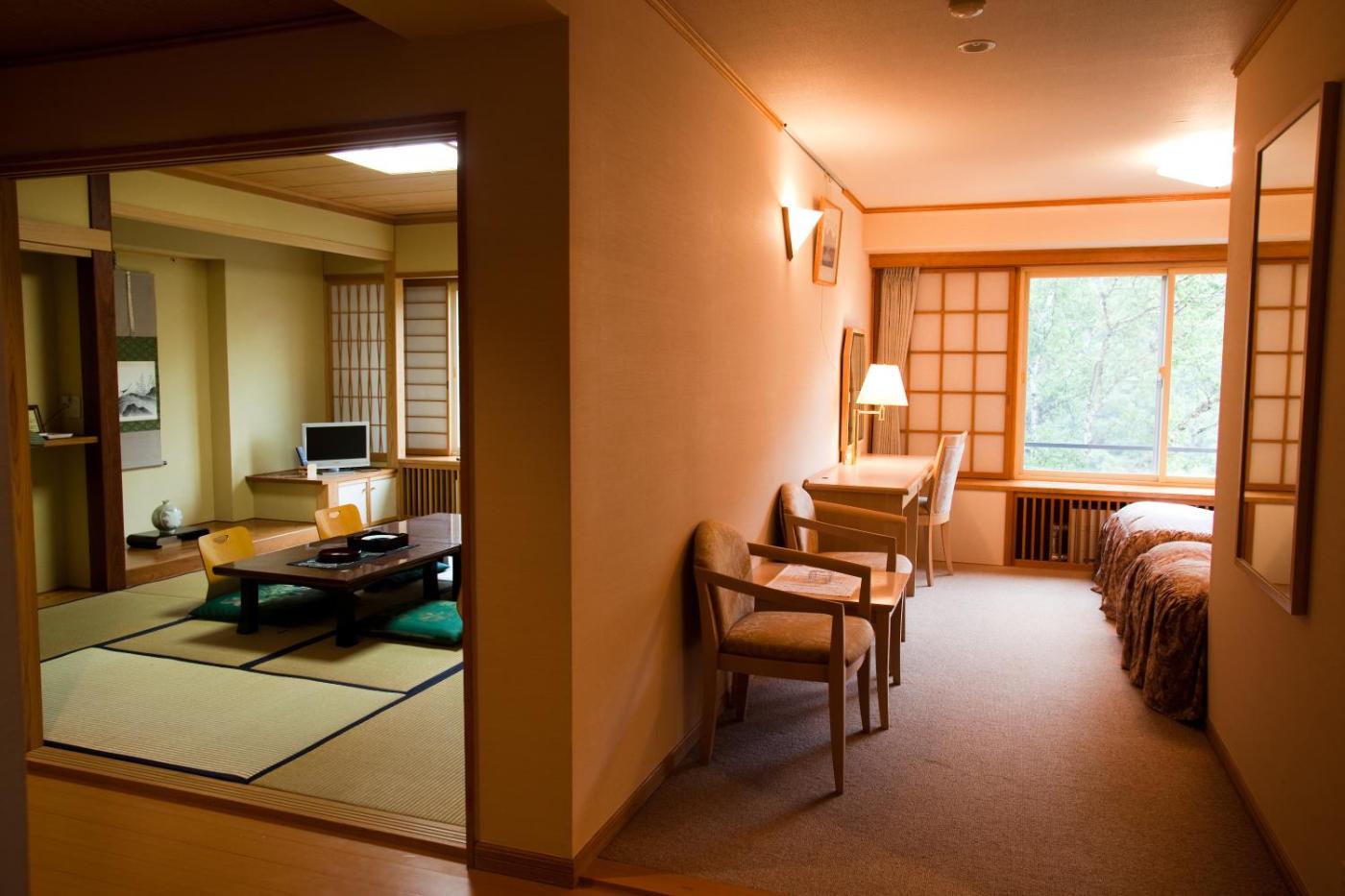 Carpeted rooms overlook the ski slope, and feature a comfortable seating area with a sofa and a flat-screen TV. They are equipped with a mini-fridge, a safe and an en suite bathroom. Yukata robes and green tea are provided. Rooms are not air conditioned.