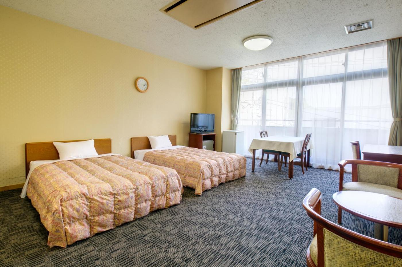Twin Room. The twin room offers air conditioning, a tea and coffee maker, as well as a private bathroom boasting a bath and a hairdryer. The twin room has carpeted floors, a seating area with a flat-screen TV, a wardrobe, a safe deposit box, as well as yukata. The unit has 2 beds. ;
